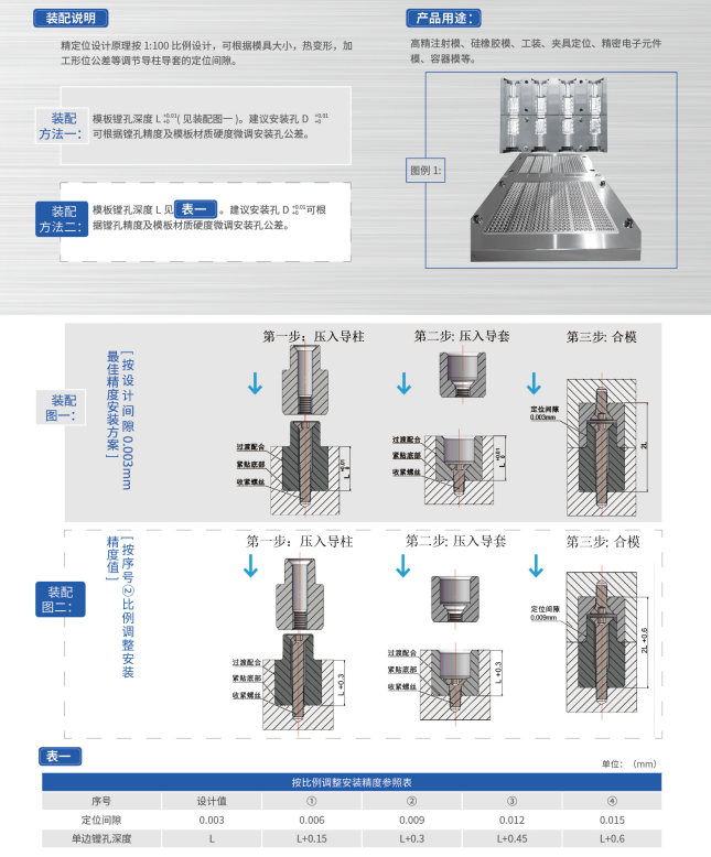 4.設(shè)計(jì)定位間隙0.003mm(間隙可調(diào)節(jié),例:要增加定位間隙0.001mm,就把導(dǎo)柱套孔各鏜深0.05mm)。