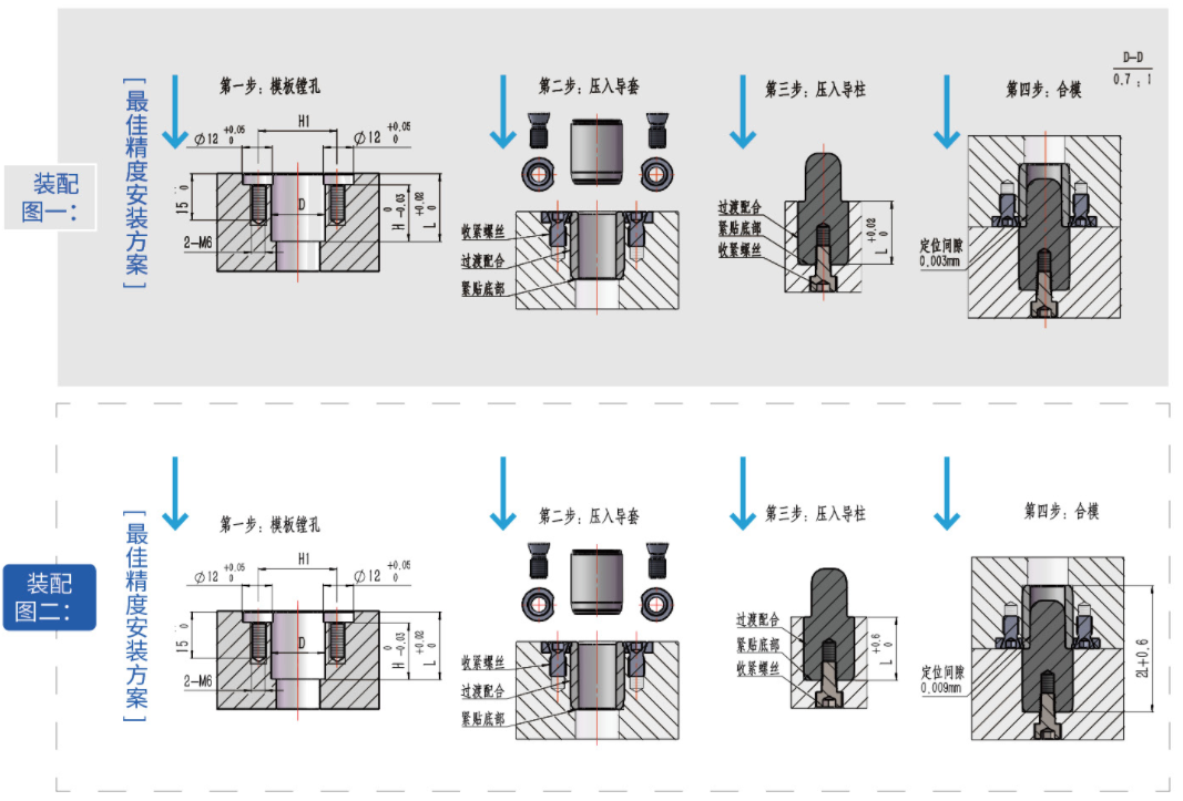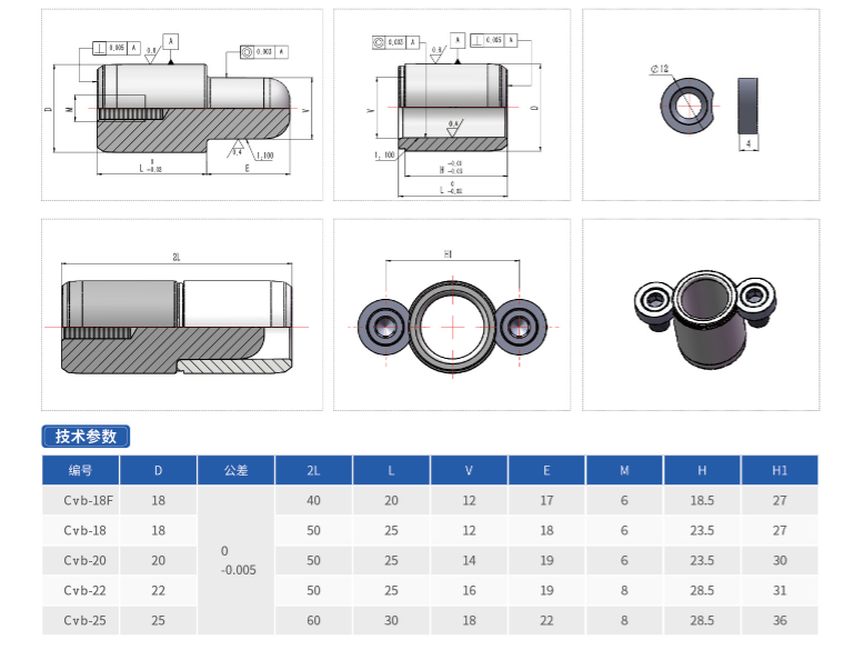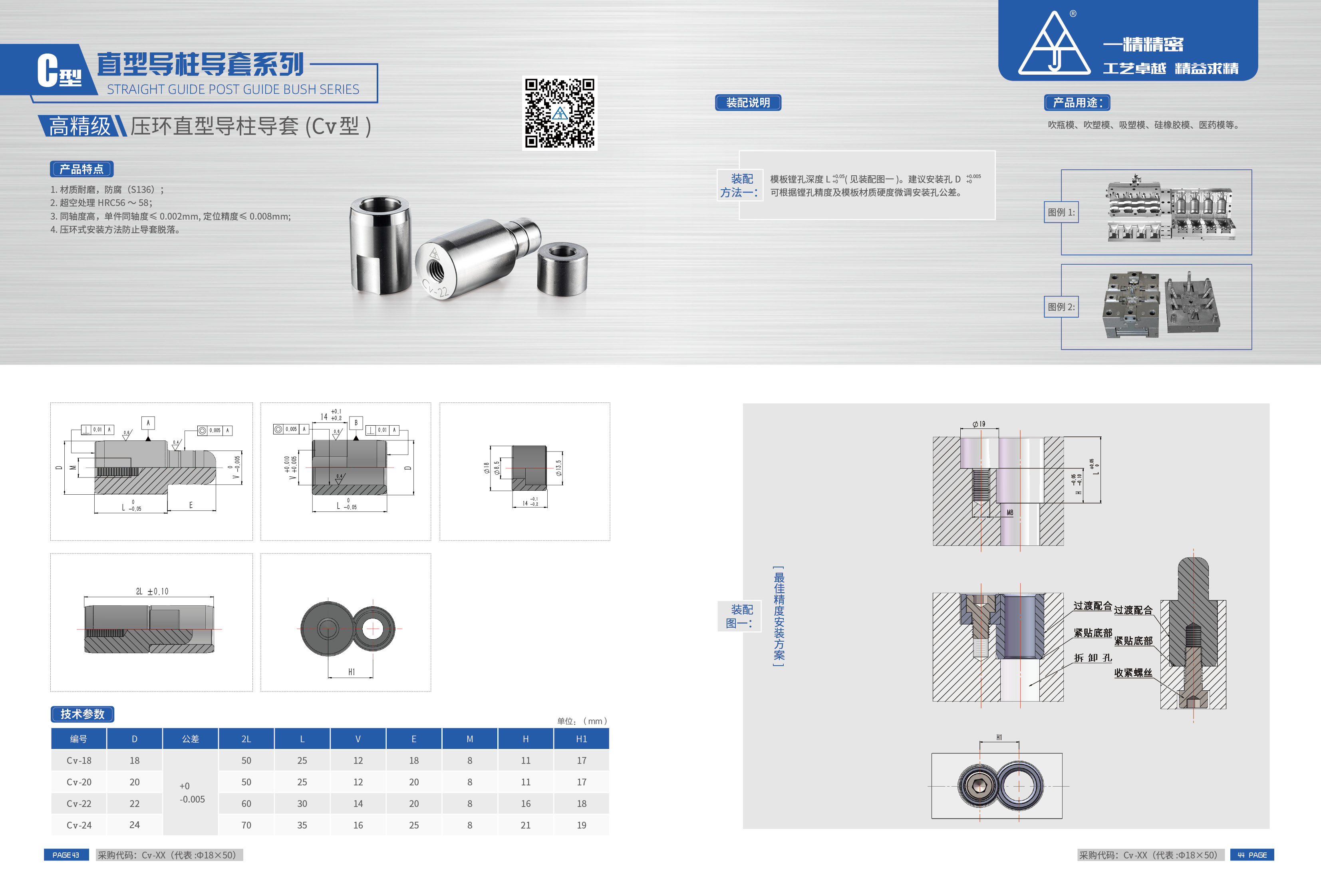 材質(zhì)防銹耐磨,防腐(D2),超空處理HRC60~62,同軸度高,單件同軸度≤0.002mm,定位精度≤0.008mm,壓環(huán)式安裝方法防止導(dǎo)套脫落