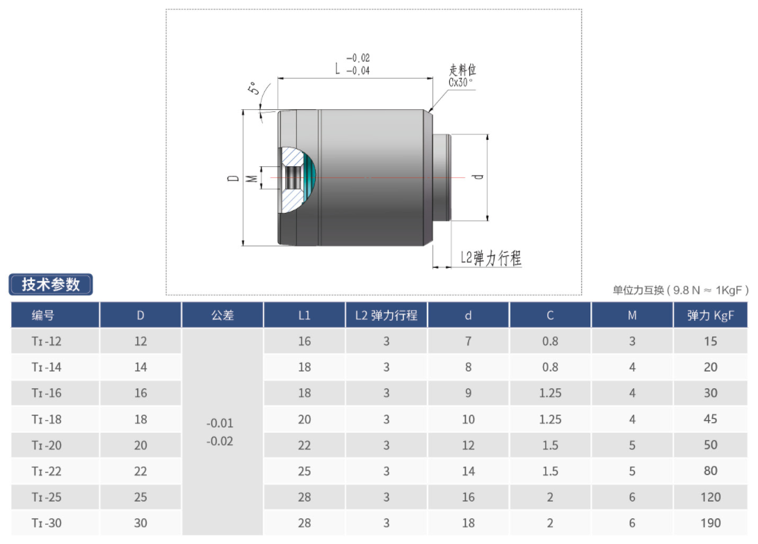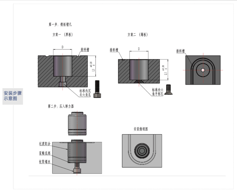模板鏜孔深度L1=(彈力器)L1(+0.1~+0.2mm),與安裝孔【間隙配合】,建議鏜孔直徑=D+0.04~+0.06mm,適用于橡膠模;